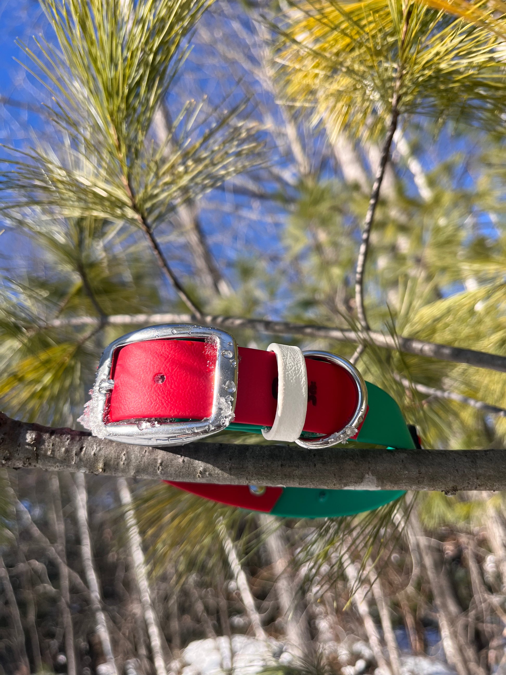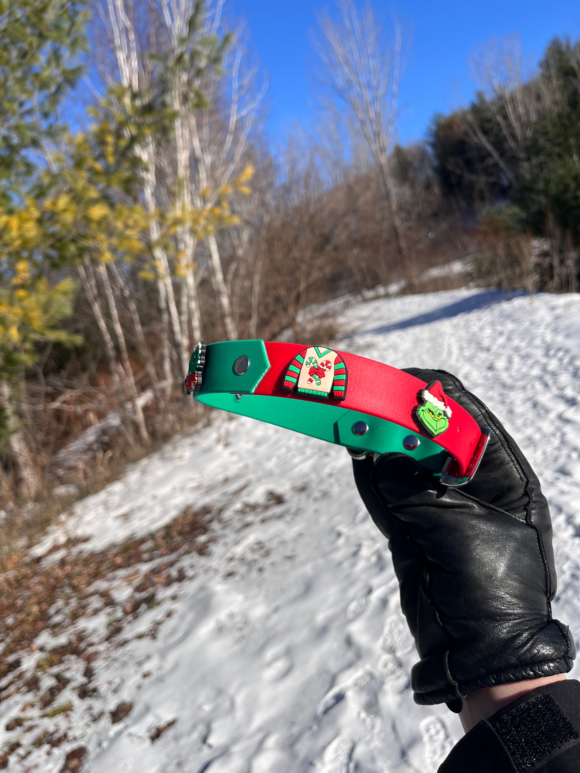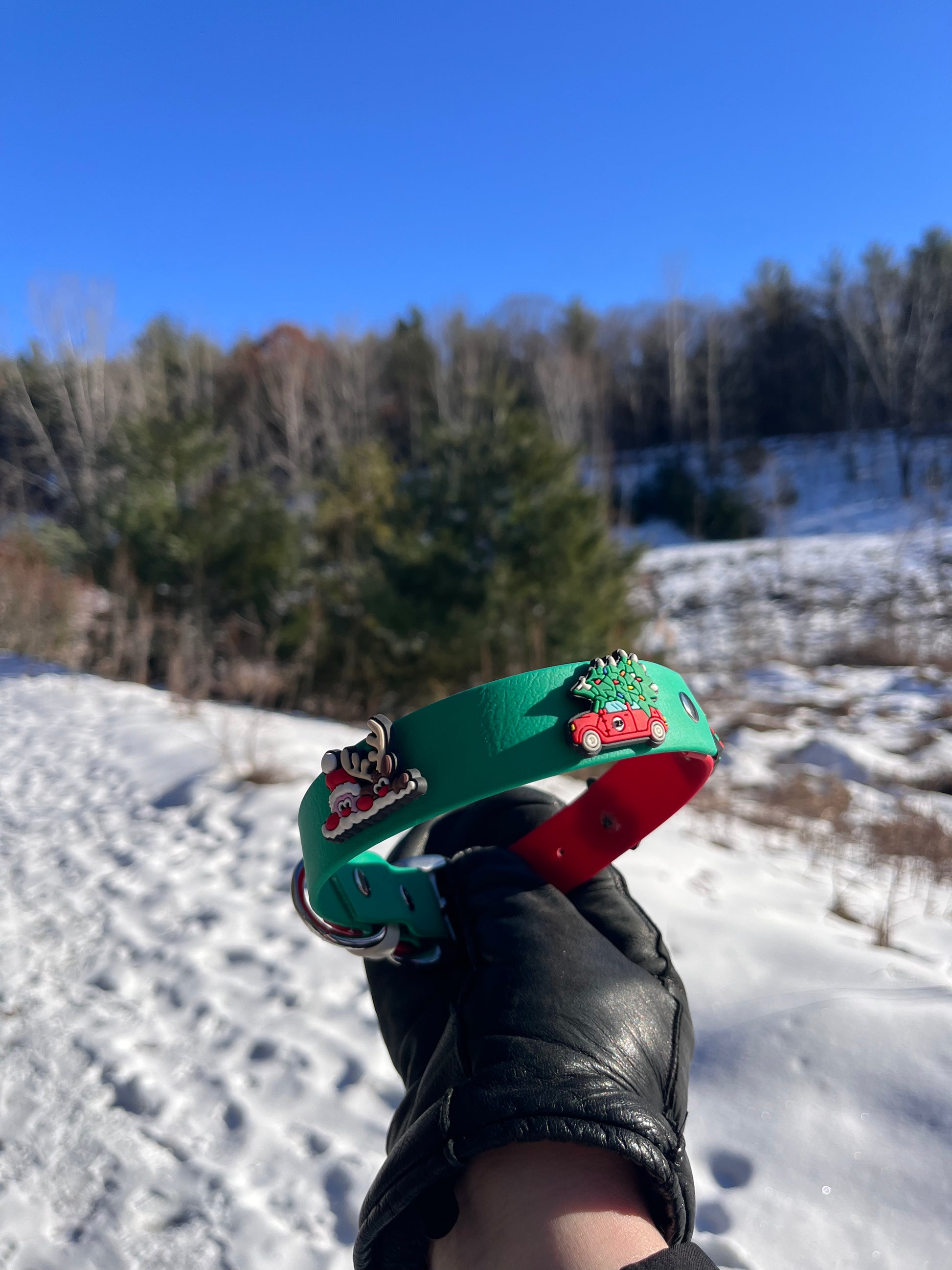 Le modèle VALAR créé en 1 pouce de largeur avec les couleurs rouge et vert émeraude. Plusieurs pins avec thématique Noël rajoutés